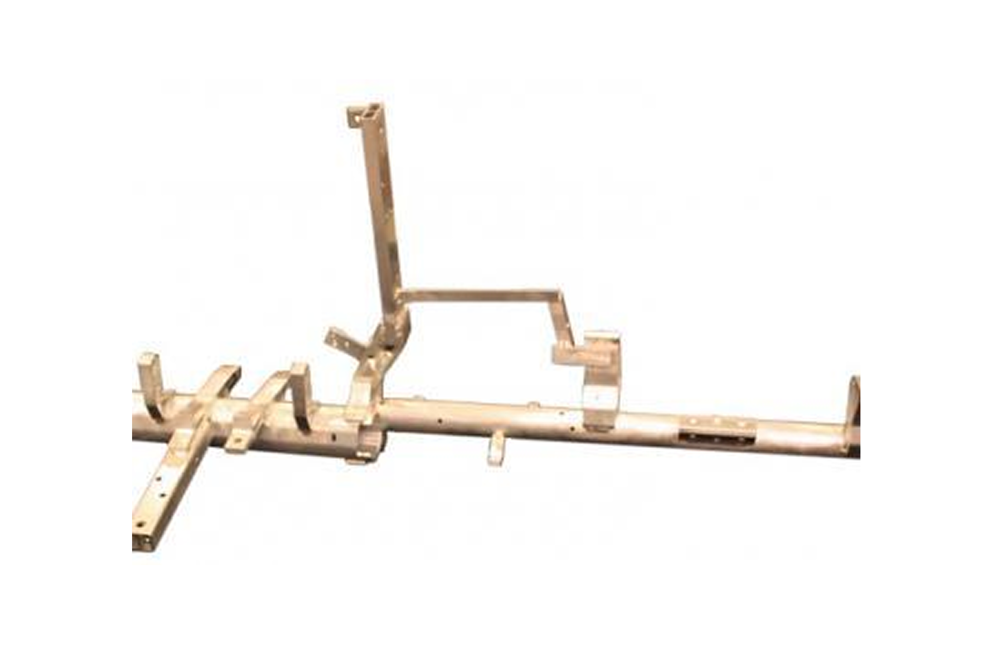 Novel design utilizing an aluminum extrusion as the central structure, with over-molded plastic and bolted-on castings in support areas.