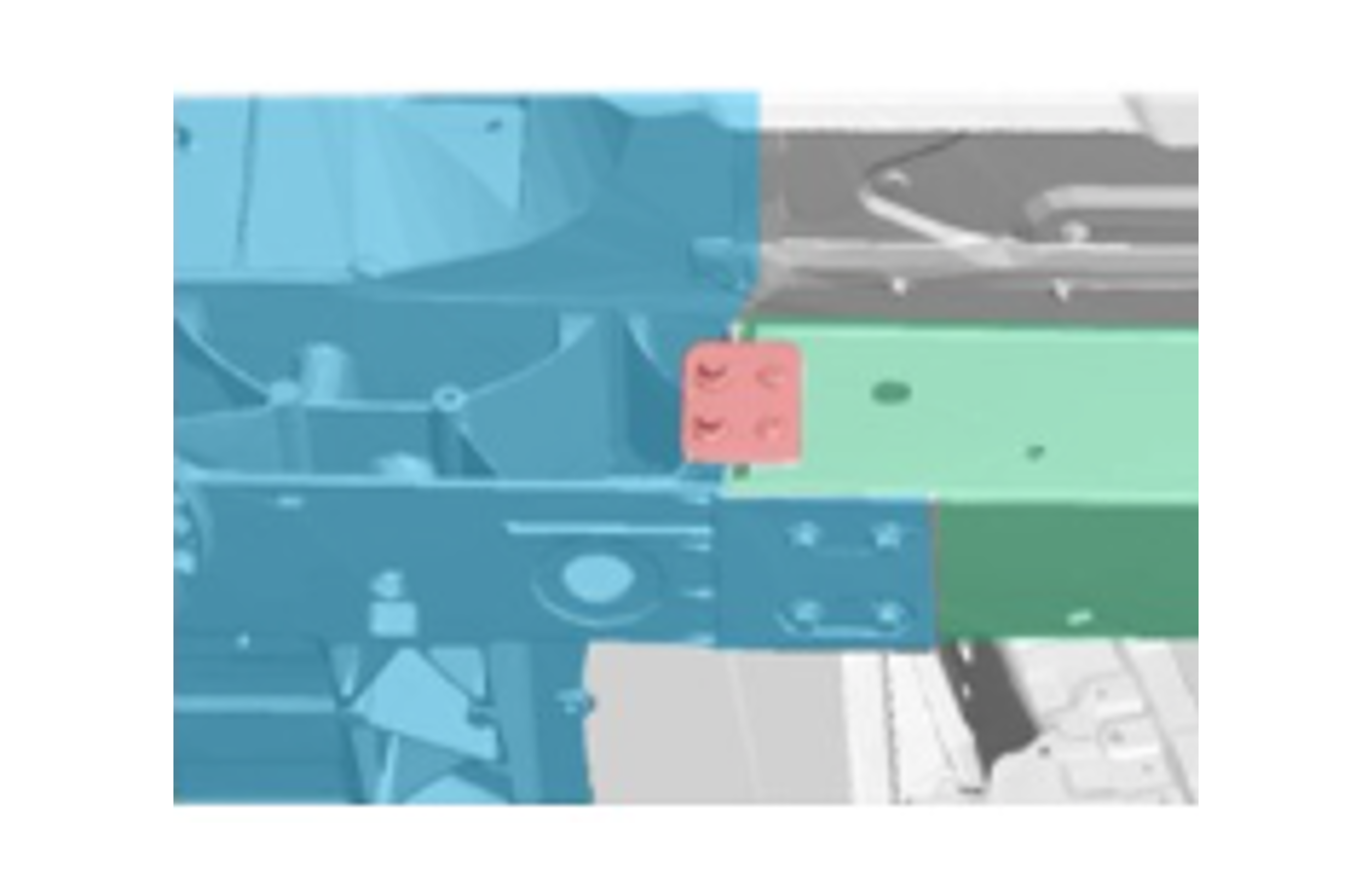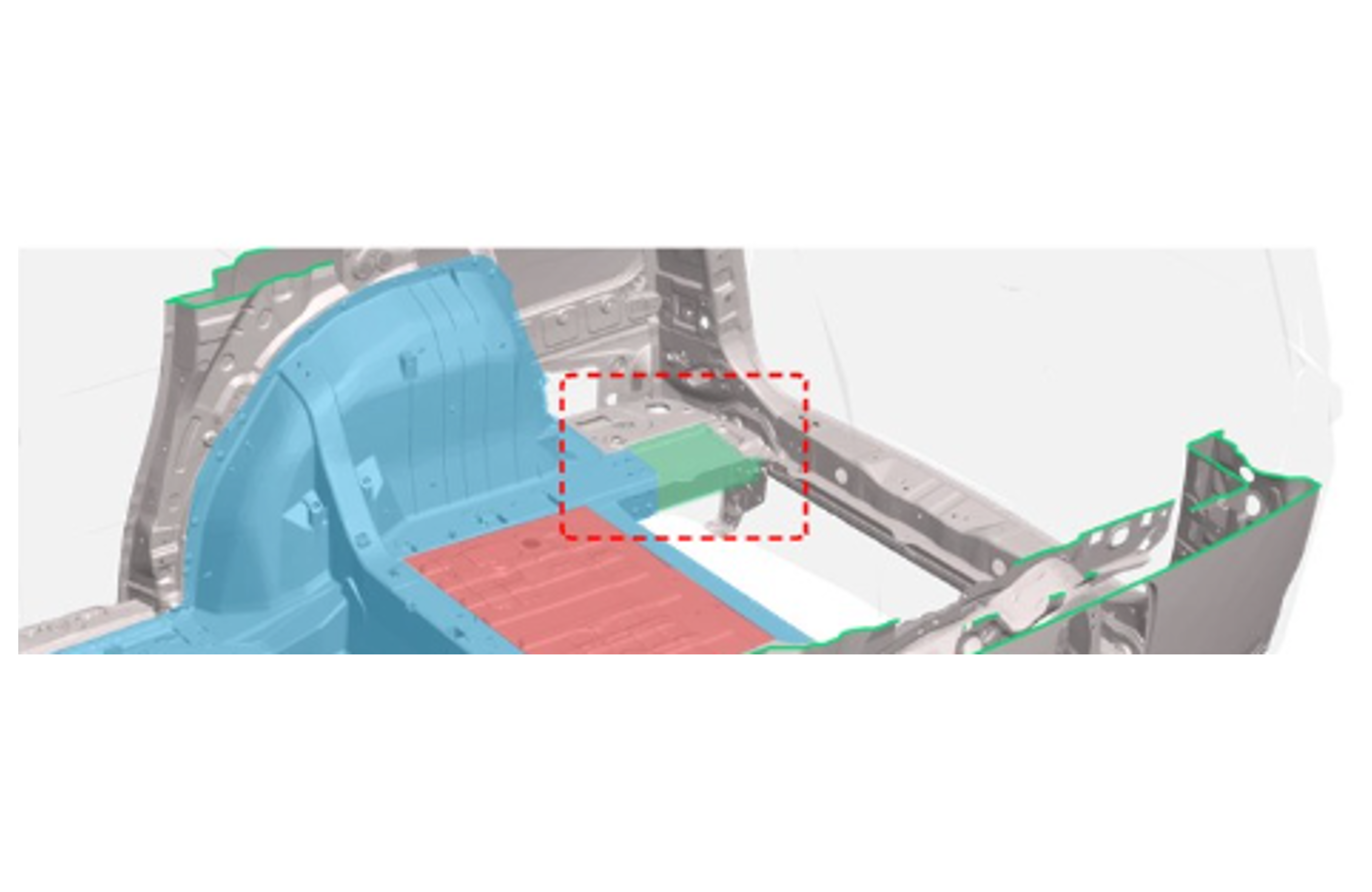 The Mustang Mach-E program paid particular attention to the small offset reinforced barrier (SORB) test. Ford set their sights on a 5-star rating. To achieve it, the bumper beam was extended outward from the crash cans in both directions. This image highlights the bumper beam extended portion, as well as the reinforcement in the crash can.