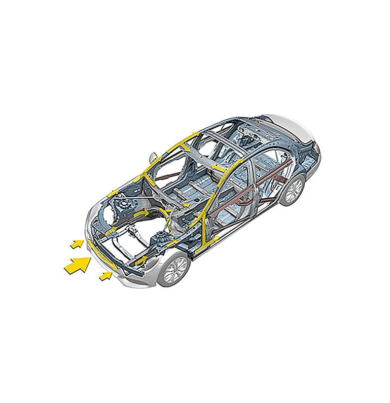 In a frontal crash, the load path begins at the bumper structure. The aluminum extrusion crushes and absorbs energy. Next in line are the extruded crush (crash) cans. Energy then moves into the extruded rails and is then directed around the passenger compartment. The goal is to protect the passengers.
