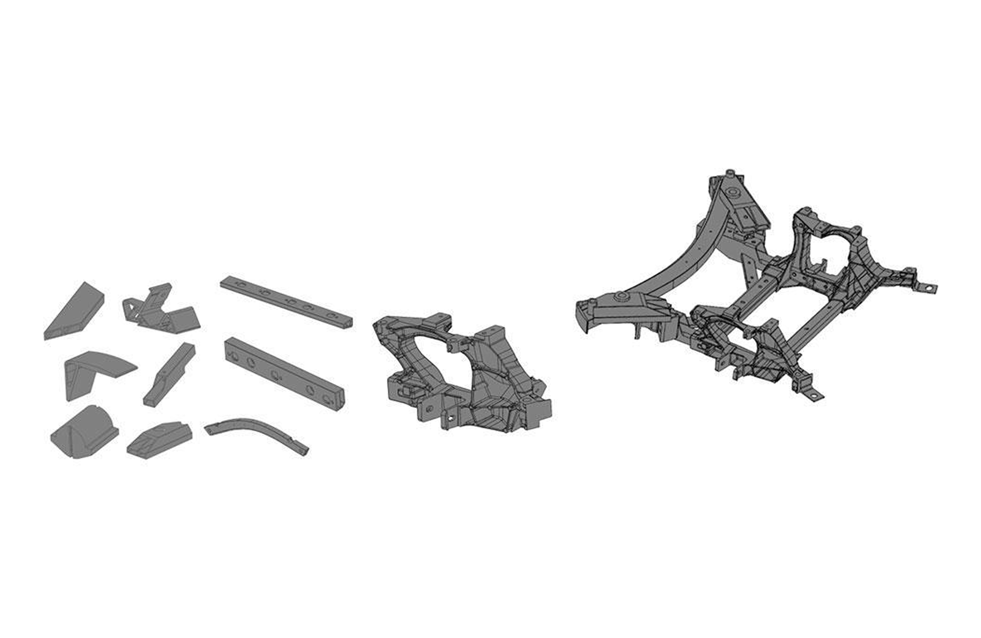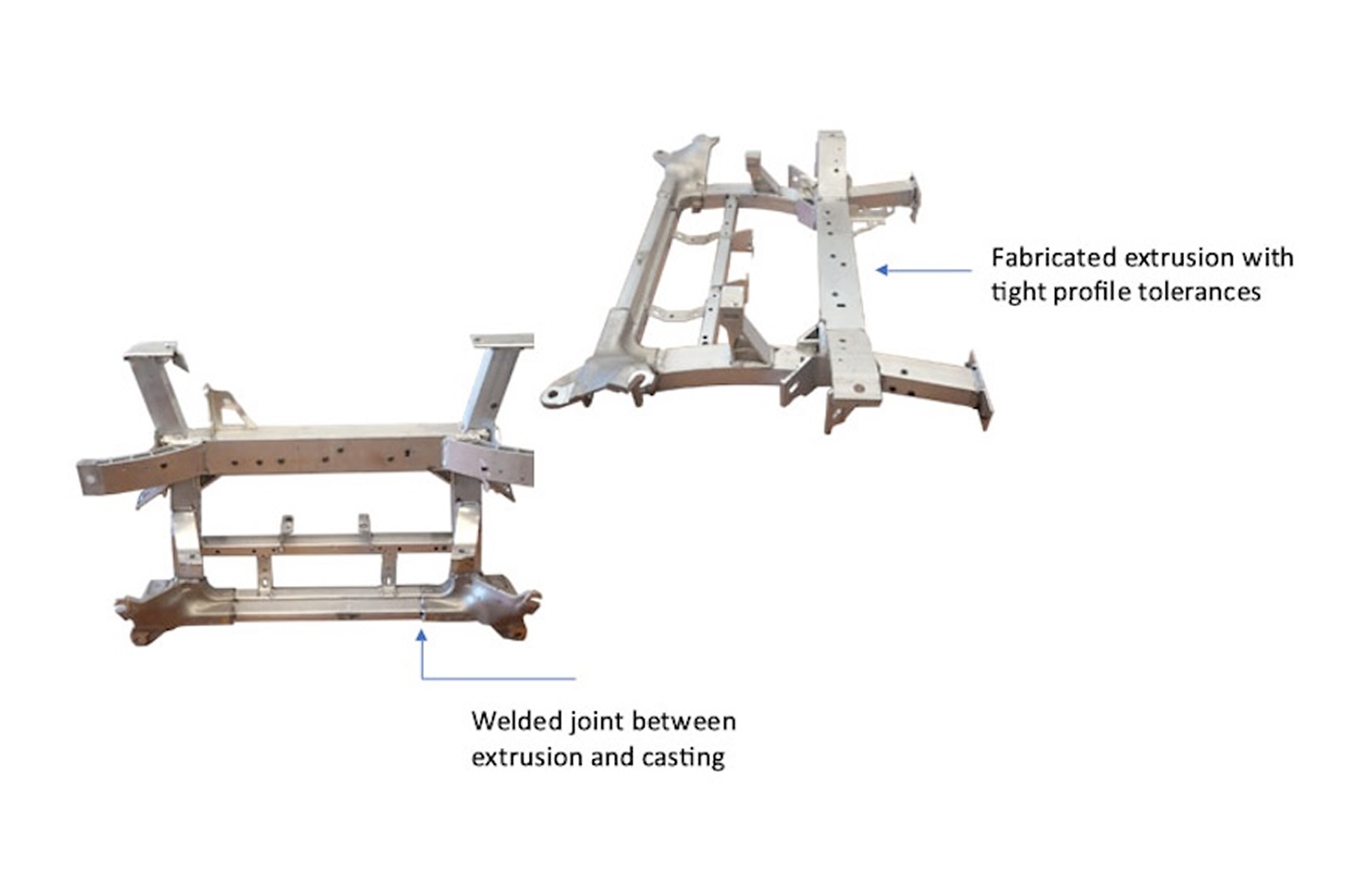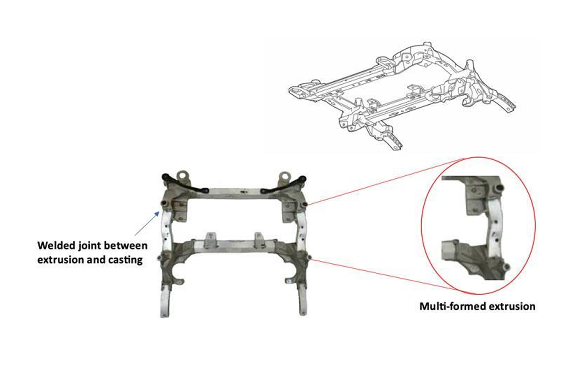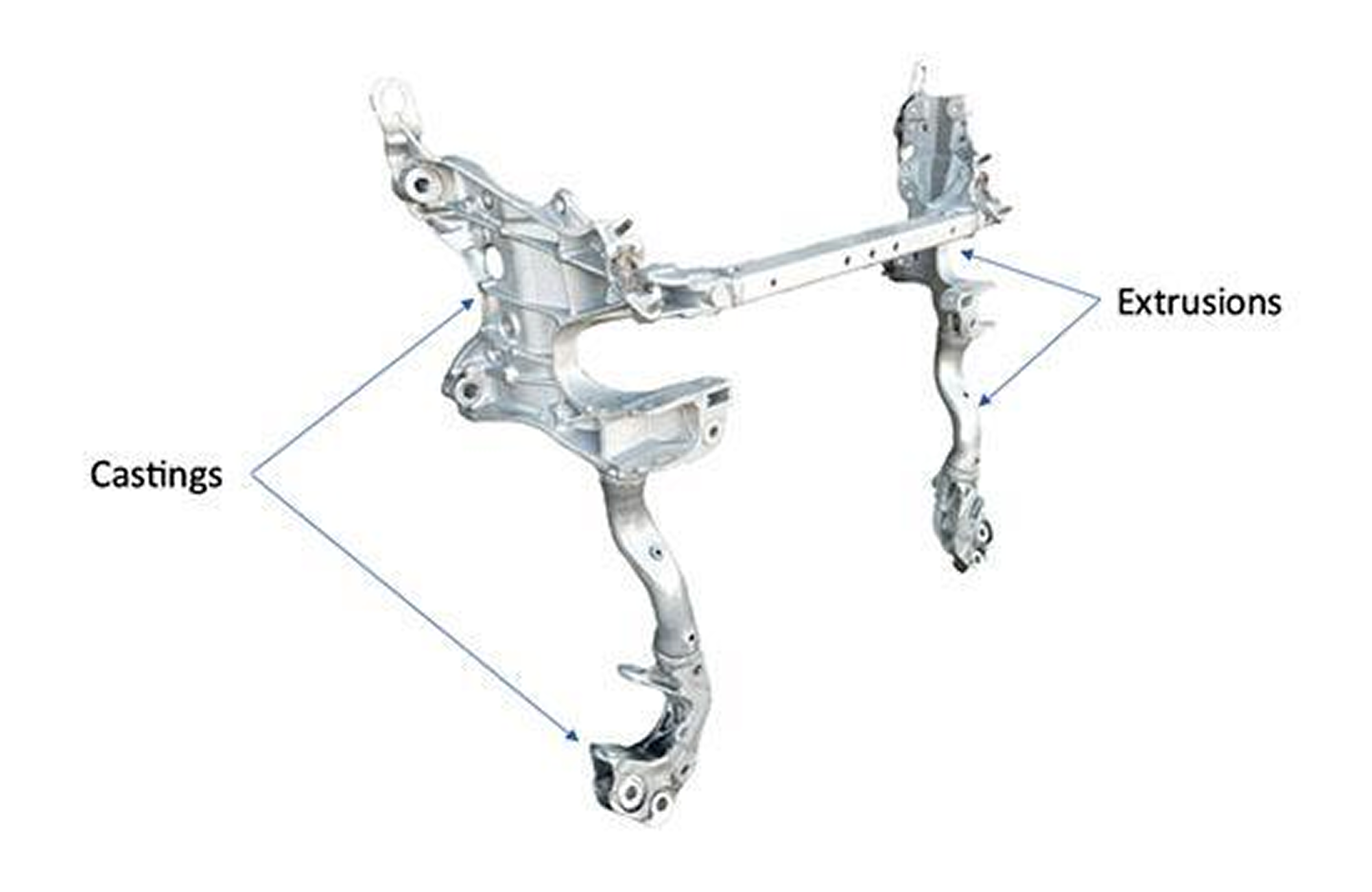 - Hybrid aluminum subframe, extrusions & castings, welded